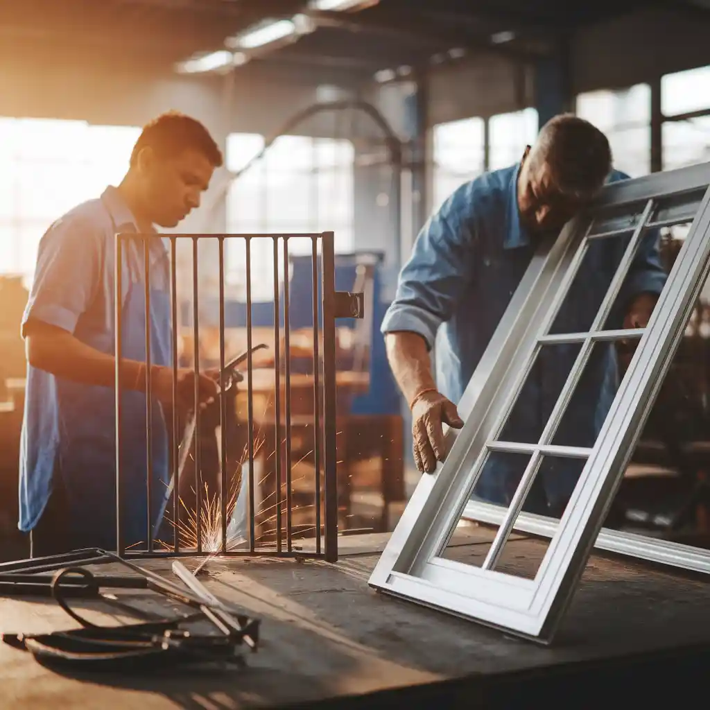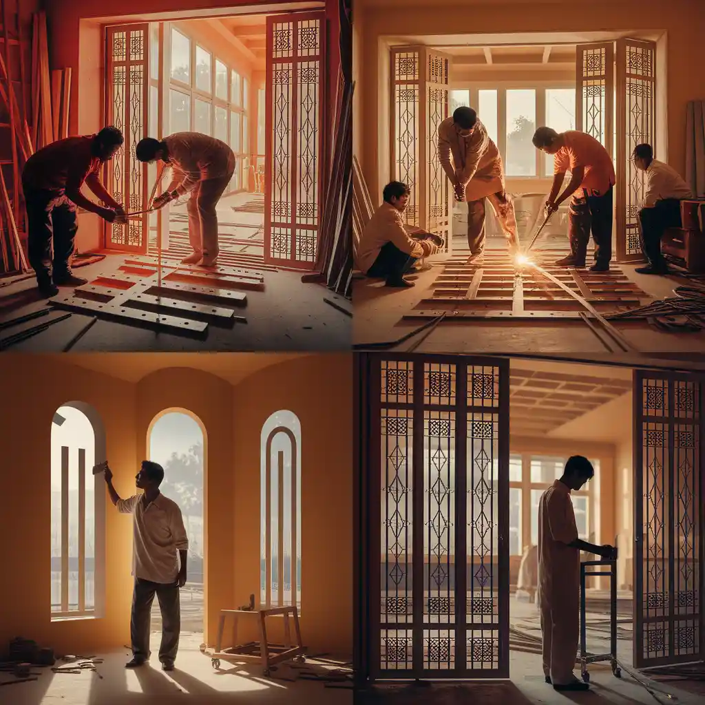 Indian workshop and construction site scene showing skilled workers welding, installing gates, fitting aluminium windows, and painting interiors, high detail, warm natural lighting, professional industrial and fabrication environment, no text